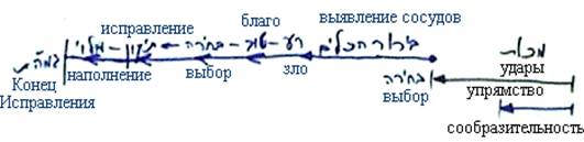 Если же ты смышленее, то быстрее соображаешь, что к чему. С того момента, как ты это осознал, у тебя появляется свобода выбора. Время самих ударов в расчет не принимается. Ты получаешь их в назначенное время, пока не настрадаешься и не поумнеешь. Выбор все равно возникает лишь в этой точке, иными словами, выявление сосудов начинается с момента возникновения свободного выбора и далее. Происходит осознание зла, а затем осмысление того, что такое благо. Потом наступает выбор посредством учебы и пр., потом – исправление сосудов, потом – их наполнение, пока ты не достигаешь Конца Исправления.