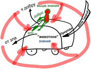Отсюда ясно, что у нас есть свобода в том, чтобы выстраивать над "животным" уровнем человеческую ступень – Человека, который оседлает "животное" и будет управлять своей природой. Для этого он тоже воспользуется двумя силами – но уже другими: теперь он будет определять добро и зло посредством хорошего окружения, которое наполняет его.