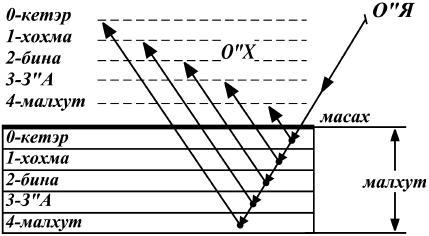 Итак, свет приходит через четыре стадии к малхут и ударяет в масах, стоящий перед ней. Малхут состоит из пяти отсеков – желаний с масахом соответствующей силы отталкивания в каждом. Самое слабое желание – в отсеке кетэр, находящемся в малхут. Более сильное – в отсеке хохма в малхут и так далее, а самое сильное – в отсеке малхут в малхут.