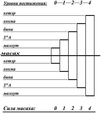 Приобретая масах, кли как бы растет от жесткости 0 до жесткости 4. Поэтому в таком порядке мы и называем сфирот: кетэр, хохма, бина, З"А, малхут (КАХАБ"ТУМ). Но по мере роста кли свет входит в нее в обратном порядке – от слабого к сильному: от ор нэфеш до ор йехида. И поэтому мы называем света в обратном порядке: нэфеш, руах, нэшама, хая, йехида (НаРаНХа"Й).