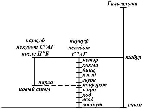 Положительное же следствие Цимцум-Бет (Ц"Б) состоит в том, что теперь от табура до парса, то есть в кли ашпаа (дающем) – от кетэр до тифэрэт – может распространиться и ор хохма, как над табуром Гальгальты. То есть табур – граница распространения ор хохма – спустился как бы до нового уровня – парса.