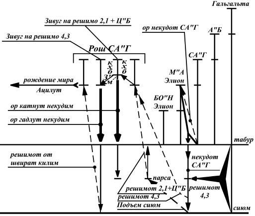 3. Теперь масах может удовлетворить желание решимо 4,3, полученное им из соф Гальгальты, то есть получить на них порцию света. Так как решимо 4,3 получено из соф Гальгальты, то есть оно еще не несет информации о Ц"Б, то зивуг на него обычный, и потому масах, стоящий в рош СА"Г, спускается из бины обратно в пэ и делает зивуг с внутренним светом (ор яшар) согласно этому решимо с показателями 4,3.