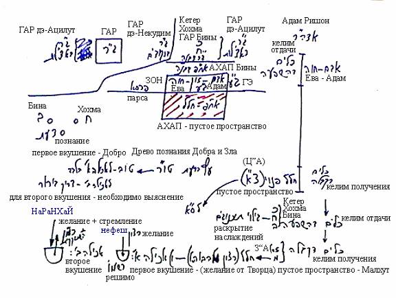 Я уже сделал обзор всего процесса с самого начала и до конца. Адам Ришон родился «обрезанным», с возможностью использования лишь отдающих келим. Он не знает, что представляют собой келим получения. Есть общее желание, но на его использование существует запрет, что не создает никакой проблемы, так как это желание является просто пустым пространством.