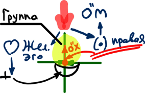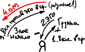 В той мере, в которой в тебе возникают какие-то побуждения, ты их реализуешь в связи с группой, ты якобы настраиваешься на группу, на связь с ней. Вот это – я. Я настраиваюсь на группу, на связь с ней, и в итоге получаю от нее отторжение. Я иду на плюс, а в итоге получаю минус (отторжение). Это отторжение мы называем "злое начало", т.е. то, что я должен исправлять.