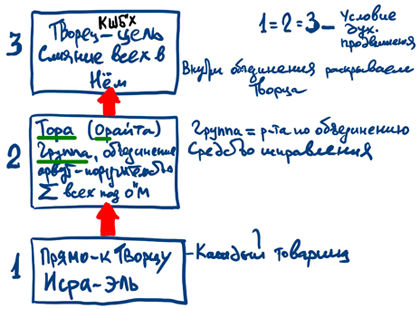 Есть Исра-Эль, что означает "прямо к Творцу". То есть Исраэль – это каждый товарищ, устремленный к духовному постижению. И есть блок, который называется Тора – на арамите "орайта", от слова ор (свет). В понятие "Тора" входит группа, объединение, поручительство (арвут) и т.д. – в общем, сумма всех действий под влиянием окружающего света (ор макиф). Это – средство исправления. А Творец, т.е. слияние всех в Нем – наша цель. Именно по такому пути мы должны идти.