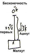 Сосуд творения примет тогда следующий вид (См. рис. 9). Творение, Малхут будет получающей частью, а девять первых сфирот, протянувшихся к ней от Бесконечности, станут миром Ацилут по своему уровню. Если же творение, очищая себя, сумеет дойти, к примеру, лишь до мира Ецира, тогда все девять первых сфирот по своим силам, категориям, по сокрытию и раскрытию будут как мир Ецира, а не Ацилут.