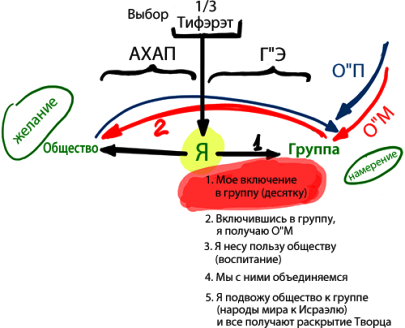 От группы я перехожу к обществу (←), а от общества – назад к группе (→), и с окружающим светом, мы получаем свыше внутренний свет (ор пними – О"П). Ведь теперь у нас есть сосуд, желание и в то же время – намерение.