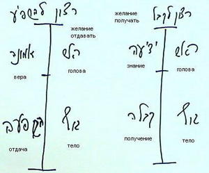 Другими словами, желание получать понимает, что стоит соблюдать Тору и заповеди, в то время как вера выше знания обязывает человека работать (без какого бы то ни было вознаграждения, платы или беспокойства о себе), то есть, идти вопреки знаниям желания получать.