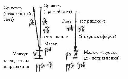И девять первых сфирот наполнены светом, а малхут сама по себе - нет в ней вообще ничего. И тайна в том, что мы различаем в каждом парцуфе два вида света - внутренний свет и окружающий свет; и два вида келим, где внутреннее кли предназначено для внутреннего света, а внешнее кли - для окружающего света.