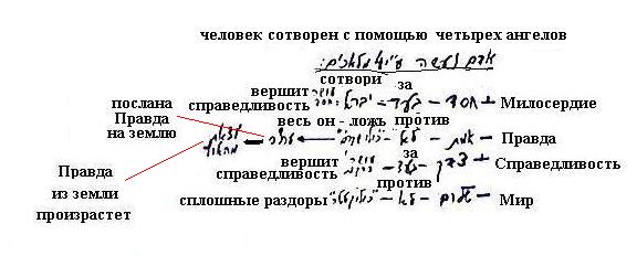 1) Все еще не разъяснен смысл сказанного "Был сотворен человек". Неужели Творец нуждается в совете? – в этом смысл сказанного, Творец как будто советуется с этими четырьмя свойствами. Как будто Ему не достаточно Его личной власти, того, что Он решает, управляет и может немедленно создать человека. Он должен скрыть себя и дать свободу действия силам, которые будто бы против Него, они называются четырьмя ангелами. В том случае, когда я сам не могу выполнить действие, появляется ангел – некий посланник, приобретающий различные формы и действующий вместо меня, чтобы я не проявлялся в этом действии, поскольку, если я проявлюсь, это испортит само действие и оно не сможет осуществиться. Смысл в том, что Творец должен быть скрыт, поэтому вместо него существуют эти четыре категории, действующие внутри материи.