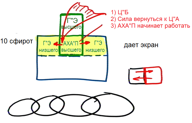 Если сверху приходит свет, давая нижней части (АХА"П) высшей ступени, находящейся под вторым сокращением (цимцум бэт), вернуться к первому сокращению (цимцум алеф), то она начинает действовать. И тогда этот свет проходит также в верхнюю часть (Гальгальта-Эйнаим) низшей ступени и исправляет ее. Получается, что АХА"П высшей ступени склеивается с Г"Э нижней ступени, становясь одним целым.