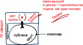 Они не получат наполнение просто так, каждому не пришлют с гонцом посылку на дом, но их жизнь наладится. Мы должны организовать публику в круги для семинаров, обсуждений за круглым столом. Главное – организовать круг. За счет того, что люди собираются в круг и отменяют себя относительно тебя, они могут включиться в твой АХА"П и передать тебе свои жалобы, желания.
