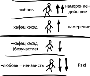 Другое дело – человек, который желает блага другим, но ничего для этого не делает (↑). Он просто желает всем милосердия – хафэц хэсэд, чистое намерение.