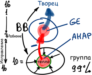 Наша изначальная потребность – это Гальгальта вэ-Эйнаим (GE), а потребность, полученная от внешней аудитории, – это АХАП (AHAP). И вот на сплав двух этих "минусов" Творец отвечает. При этом мы, со своей стороны, хотим отдать благо назад, людям. А их желание поднимаем к Творцу потому, что хотим тем самым насладить Его. Таким образом, наша группа, Бней Барух (BB), располагается посередине, хочет нести благо и Творцу, и человечеству. Ну а самим нам ничего не надо, мы – хафэц хэсэд.