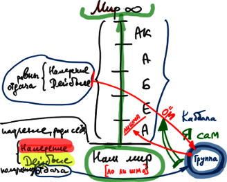 От мира Бесконечности к нашему миру спускаются пять миров: Адам Кадмон (АК), Ацилут (А), Брия (Б), Ецира (Е), Асия (А) и самый последний – наш мир.
