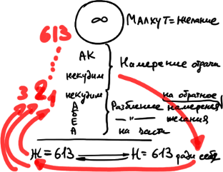 Затем в мирах Ацилут (А), Брия (Б), Ецира (Е), Асия (А) оно постепенно восстанавливается, в то время как в нашем мире желания и намерения остаются разбитыми на 613 частей.