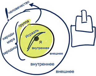 Все время расширяются понятия внутреннего и внешнего. Сначала я считался внутренней частью, а группа - внешней. Но потом, и я, и группа стали внутренней частью, а внешней частью стало человечество. Это словно ступени, которые вкладываются друг в друга. Весь мир разделяется надвое: внутренняя часть и внешняя. Внутренняя часть называется Исраэль, а внешняя - народы мира.