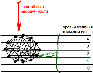 Желание каждого из нас содержит в себе пять уровней: 0-1-2-3-4. И все принимаемые нами формы в нашем стремлении уподобиться постоянному высшему свету, определяются изменениями, происходящими в нашем желании насладиться. Сам высший свет - простой и неизменный, наполняющий все мироздание, и в нем не происходит никаких изменений. Он действует постоянно, как абсолютная любовь, океан света.