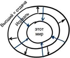 Высшая сила отдачи объемлет нас всех со всех сторон. Внутри нее, самым близким к ней кругом находится Исраэль, а внутри него – народы мира. Чем более "круглым" будет Исраэль и соответствующим высшей силе, тем теснее он сможет приблизить ее к народам мира, усилить ее влияние на них. Так соединяются все три круга: высший, средний и нижний.
