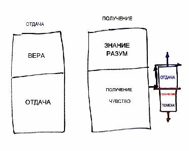 Как ты это выстраиваешь? В определенном состоянии происходит получение знания и чувства, которые направлены против духовного (см. правую крайнюю часть рисунка). И несмотря на них, тебе нужно посредством отдачи, посредством веры сформировать над этим стремление к Творцу, осознание важности духовного. Это и называется «верой выше знания».