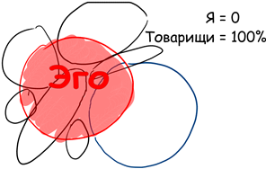 Всё реализуется благодаря тому, что каждый из нас силой старается склонить себя и как-то подключиться к товарищам. Я освобождаю в себе некий сегмент, сектор, в который товарищ может войти. Затем я освобождаю другую часть, и еще, и еще, пока все товарищи не наполняют меня. В результате я отменяю себя до нуля, а товарищи составляют 100%.