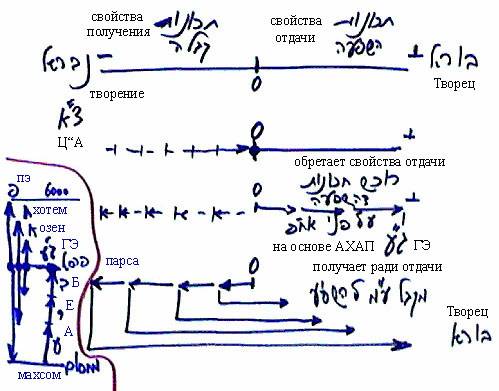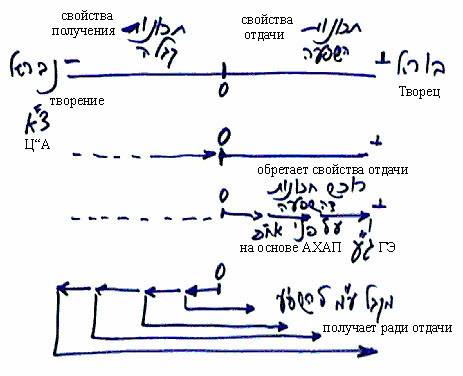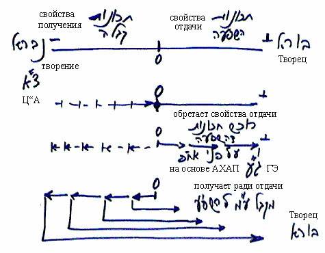 Затем творение начинает раз за разом возвращаться от нуля к «минусу» и обращать его в «плюс», пока не достигает крайнего отрицательного полюса и обращает его в крайний положительный. Это называется получением ради отдачи. Творение приобретает свойства отдачи на основе АХАП – келим получения. Каждый раз АХАП в нем как будто возрастает, но на его основе творение приобретает Гальгальта Эйнаим.