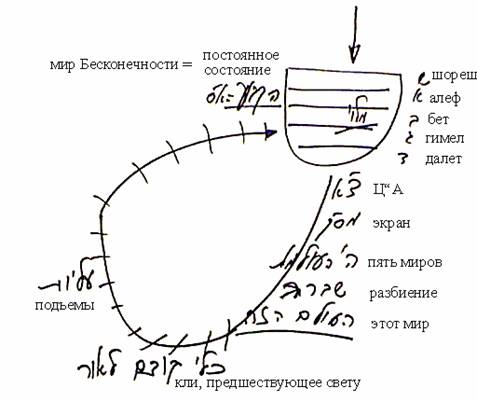 Наши буквы являются результатом Второго Сокращения, а оно уже поглощено Первым Сокращением, поэтому буквы исчезают, и у нас нет слов, нет языка для выражения более высоких ступеней, чем Арих Анпин мира Ацилут, а тем более – мира Бесконечности и находящегося выше него.