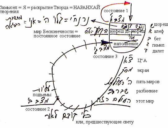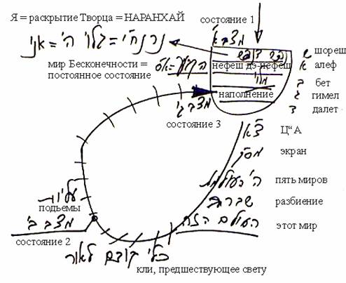 Когда-то я ощущал свет нефеш дэ-нефеш в мире Бесконечности, в начальном состоянии, называемом Бааль Суламом во «Вступлении к Книге Зоар» первым состоянием (алеф). Когда я прохожу весь этот процесс, называемый вторым состоянием (бет), и возвращаюсь к тому же состоянию, в котором был все это время, только бессознательно, - это называется третьим состоянием (гимел). Я возвращаюсь в него в своем кли, в своем желании, в своем понимании, и тогда вместо света нефеш дэ-нефеш ощущаю НАРАНХАЙ светов.