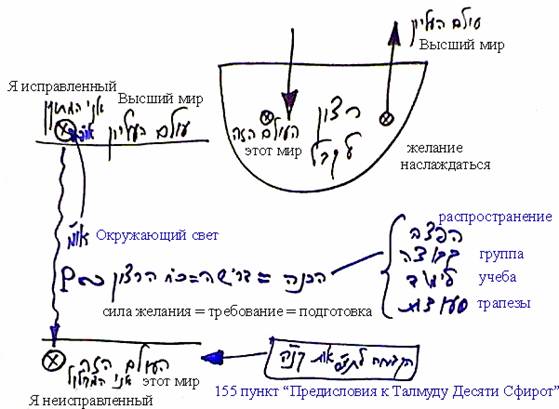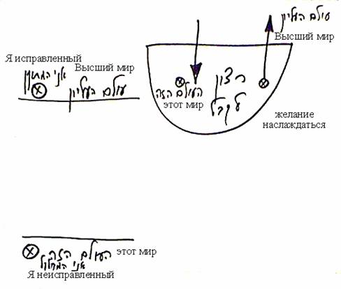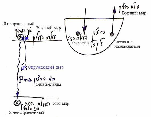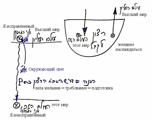 Есть уровень духовного мира - Высшего мира, и уровень этого мира. Сейчас я нахожусь на уровне этого мира – «неисправленный Я». А на уровне Высшего мира я нахожусь в исправленном состоянии – «исправленный Я». Я – неисправленный - желаю стать исправленным. Тем самым я притягиваю Окружающий свет, который в моем исправленном состоянии находится во мне как внутренний свет.
