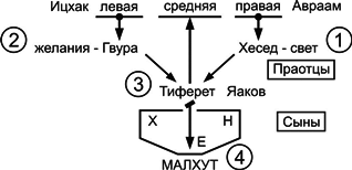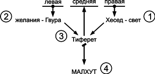 На самом деле все не так просто, как мы говорили… Помимо хесед, гвуры и тиферет, перед малхут находятся еще три сфиры: нецах, ход, есод – дополнительная система, которая помогает мне собрать и обобщить все данные, получаемые свыше.