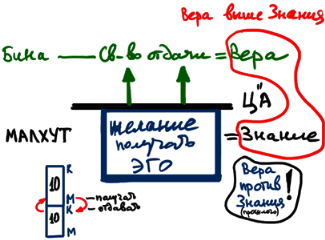 Допустим, есть желание получать или наш эгоизм. Если я ставлю преграду и не желаю ничего получать для себя, то такое условие называется "Первое Сокращение" (Цимцум Алеф). Это уже своего рода заповедь. Если кроме этого я могу еще начать работать на внешний мир, вне себя, то это свойство называется "свойство отдачи" или "вера". Это – свойство Бины. А желание получать – это Малхут или знание.
