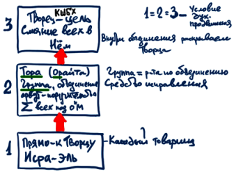 Есть Исра-Эль, что означает "прямо к Творцу". То есть Исраэль – это каждый товарищ, устремленный к духовному постижению. И есть блок, который называется Тора – на арамите "орайта", от слова ор (свет). В понятие "Тора" входит группа, объединение, поручительство (арвут) и т.д. – в общем, сумма всех действий под влиянием окружающего света (ор макиф). Это – средство исправления. А Творец, т.е. слияние всех в Нем – наша цель. Именно по такому пути мы должны идти.