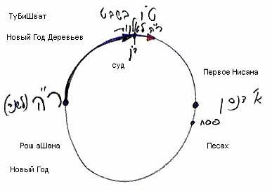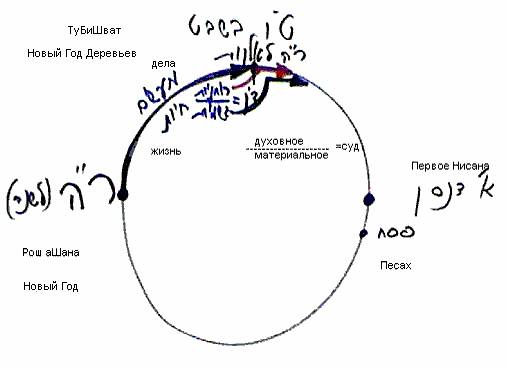 На рисунке изображен годовой кругооборот – Новый Год года, ТуБиШват - Новый Год деревьев и первое нисана – скоро у нас наступит Песах. Если человек хорошо поработал в Торе, пришел к некоторым результатам, то он судит себя, подводит итоги, решает, что делать дальше. И если он доволен своими итогами, то он продолжает идти дальше тем же путем.