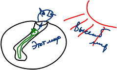 Когда червячок высовывает голову наружу и смотрит на мир, то видит, что там светит солнышко, чирикают птички. И он изумляется, отчего же все это время он жил в таком жутком мире (нашем мире), если существует такой прекрасный Высший мир?