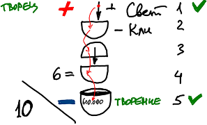 Десятка помогает изменить мое отношение к судьбе, к Творцу, не более того. Я прихожу к тому, что я ни на что не влияю, не хочу влиять и согласен со всем, что происходит. И в этом общем своем согласии со всем происходящим я действительно соединяюсь с Творцом. Десятка для меня становится инструментом единения с Творцом. Без нее я не сумел бы адаптироваться к Творцу. От Творца к творению, и от творения к Творцу – это то, что каждый из нас делает в десятке (см. рис. выше).