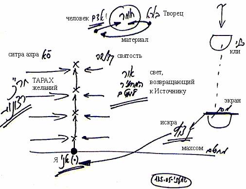 Каждый раз мы получаем новые желания и должны исправить их, переходя из одного состояния в другое, с помощью света, возвращающего к Источнику. С одной стороны я получаю свет, возвращающий к Источнику, и свет, наполняющий исправленное кли. Тем самым я каждый раз строю новое состояние. С другой стороны находятся 620 (ТАРАХ) желаний. А кто я? Я – это точка, строящая образ Творца. С левой стороны находится Фараон или ситра ахра, а с правой – святость.
