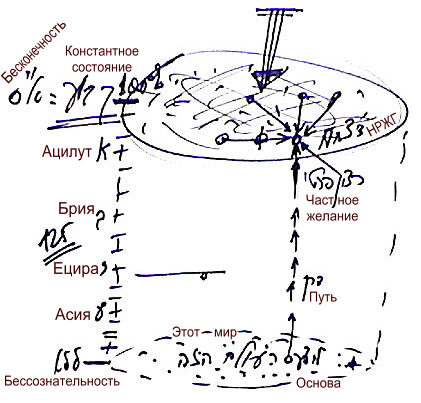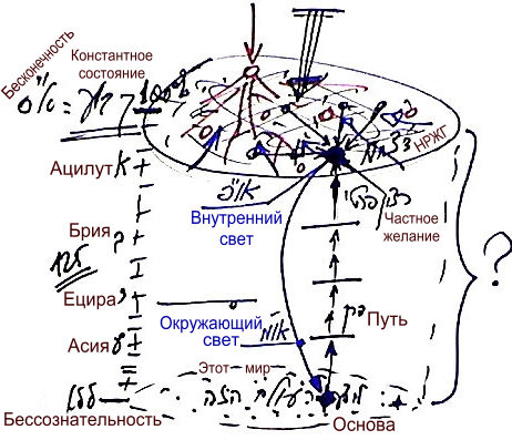 «Этот мир» является воображаемым состоянием, подобно всем остальным состояниям, лежащим на пути к Концу Исправления (см. вопросительный знак на чертеже). Все они в действительности не существуют, представляя собой всё то же константное, единственно существующее состояние, которое видится нам смутным, затуманенным. Это мы видим его таким. Ты и я вместе со всем человечеством и со всем миром на самом деле находимся наверху, в вечном мире, в неразрывной духовности. Только в наши органы ощущений вкрался дефект, и вместо своего истинного состояния мы видим нечто мрачное, мутное, почти ничего не различая в подлинном состоянии. Мы ощущаем себя и мир настолько слабо, что сознание наше почти полностью отключено. Такая картина и называется «этим миром».