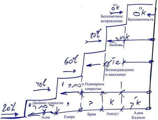 Проходя через миры, бесконечное управление постепенно убавляется. К нашей ступени двойного сокрытия оно приходит после того, как пересекло все миры: Адам Кадмон (АК), Ацилут, Брия, Ецира и Асия. С другой стороны, по мере исправления человека, управление открывает себя.