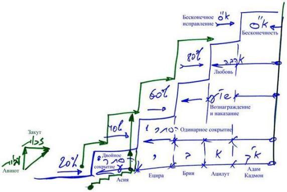 Как идет продвижение по ступеням? Я понемногу поднимаюсь и произвожу исправления, снова и снова, пока не выхожу на следующую ступень (зеленая ступенчатая линия на чертеже сверху). Таким образом, высота ступени свидетельствует об авиюте, о глубине желания, а продвижение к Источнику управления – о чистоте (закут). Я исправляю «толщу» желания и превращаю ее в чистоту. Однако без авиюта мне нечего было бы исправлять. Это и называется «продвижением».