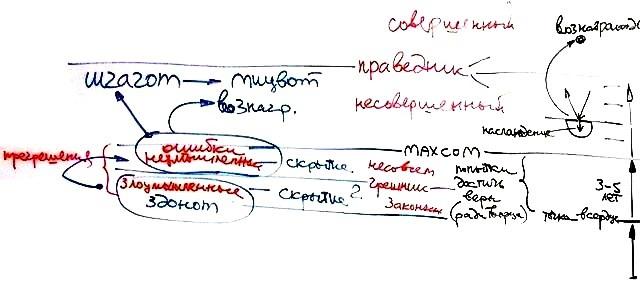 Получается, что когда я иду от махсома наверх, то я одновременно спускаюсь от махсома вниз. То есть, если я хочу сейчас взойти на какую-то ступеньку "n", то должен спуститься на ступеньку "n" и ее исправить. Если я хочу подняться на ступеньку n+1, то я должен спуститься на ступеньку n–1, и тогда я, исправляя ее, поднимаюсь на ступеньку n+1. То есть подъем вверх означает спуск вниз в своих желаниях во все более, более, более большие прегрешения, а потом во все более, более, более злоумышленные нарушения – и таким образом я поднимаюсь наверх.