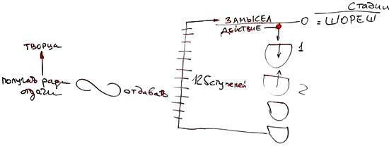 Стадия шореш делится на две части. Из низшей части рождается стадия один. Стадия один – желание получить. Затем появляется стадия два – желание отдавать. Здесь уже проявляется действие Творца относительно нас. А выше, в верхней части нулевой стадии – Его замысел.
