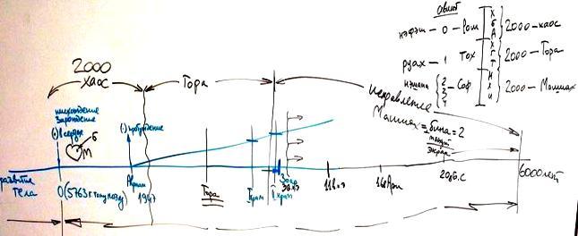 Рассмотрим график развития тела. В нулевом году (5763 года тому назад) точка в сердце начала свою деятельность – это ее первое пробуждение, то есть, зарождение, как бы нисхождение сверху вниз, или нисхождение в сердце точки в сердце. Затем, Авраам – это примерно 1947 год по этому летоисчислению.