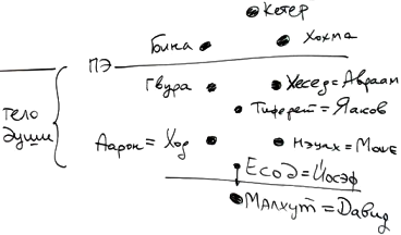 Рассмотрим это на чертеже. Хэсэд, то есть свойство Авраам, далее Гвура, Тифэрэт, Нэцах, Ход, Есод, Малхут. Есод – это Йосэф, который олицетворяет собой окончательное нисхождение в Египет, и проход – выход из Египта в Малхут – идет через свойства, которые приобретает Малхут. Тифэрэт – это Яаков; далее – Моше, Аарон, Йосэф и Давид. Эти имена надо знать, потому что они часто указываются вместо сфирот.