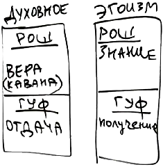 Рассмотрим на чертеже духовное и эгоистическое кли. Это будет выглядеть следующим образом: в эгоизме Рош – это знание, Гуф – получение; в духовном Рош – это намерение «ради отдачи» («кавана»), или вера, а Гуф – это сама отдача.