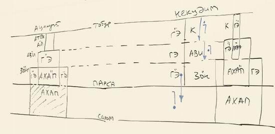 Нарисуем по-другому. ЗО"Н, Г"Э, АХА"П поднялись над парса. Аба ве-Има поднялись еще выше, и поднялись Атик с А"А. И такое состояние называется АХА"П де-алия (поднимающийся АХА"П).