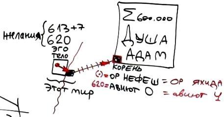 Есть такая конструкция в духовном мире, которая называется "душа" или "Адам". Душа – это сумма всех 600-от тысяч душ. Каждая частичка, одна из 600-от тысяч, облачается в тело. Мы это рисуем как будто направленным вниз, но нет ни низа, ни верха. Душа получает эгоистический "довесок". Она отрывается от первоначального состояния и, когда она сама по себе, вокруг нее (или рядом с ней) образуется эгоистический довесок.