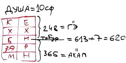 Получается, что таким образом мы сделали из себя парцуф, который состоит из 620 желаний, полностью наполненных светом НаРаНХаЙ – нефеш, руах, нешама, хая, йехида. И в ней (в душе) существует кетер, хохма, бина, З"А, малхут – 5 частей, 620 желаний, которые можно разделить таким образом: до середины бины – это 248 желаний, с середины бины и вниз – 365. Итого вместе 620 – это 613 плюс 7 окончательных, дополнительных желаний. 248 желаний можно назвать Г"Э, 365 – это можно назвать АХА"П. Все вместе – это душа, 10 сфирот.