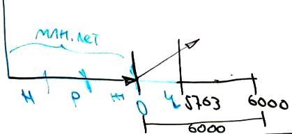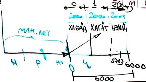 Мы начинаем отсчет с того времени, когда первый раз произошло нисхождение корня души на животный эгоизм, который за миллионы лет развился уже до уровня животного. Это нулевой год. Сегодня мы с вами находимся в пять тысяч семьсот шестьдесят третьем году, считая от этого нулевого года. И далее это будет продолжаться до шести тысяч лет (на рисунке это изображено внизу, а по высшей оси проходят миллионы лет).