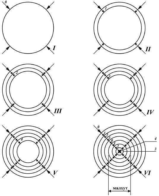 : малхут целиком наполняется светом из всех предыдущих стадий, и поэтому в ней образуются ее подстадии, отсеки, получающие свет соответственно из стадий 0 – 3, а в стадию 4 – малхут – поступает свет, предназначенный ей самой. Малхут в максимально, неограниченно наполненном состоянии называется олам Эйн Соф – мир Бесконечности.