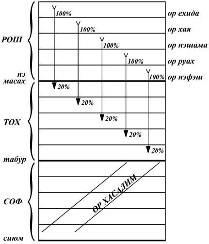 Как уже указывалось, сама малхут также состоит из пяти частей, и в каждую из них она получает свет из соответствующей сфиры-стадии, находящейся в рош.